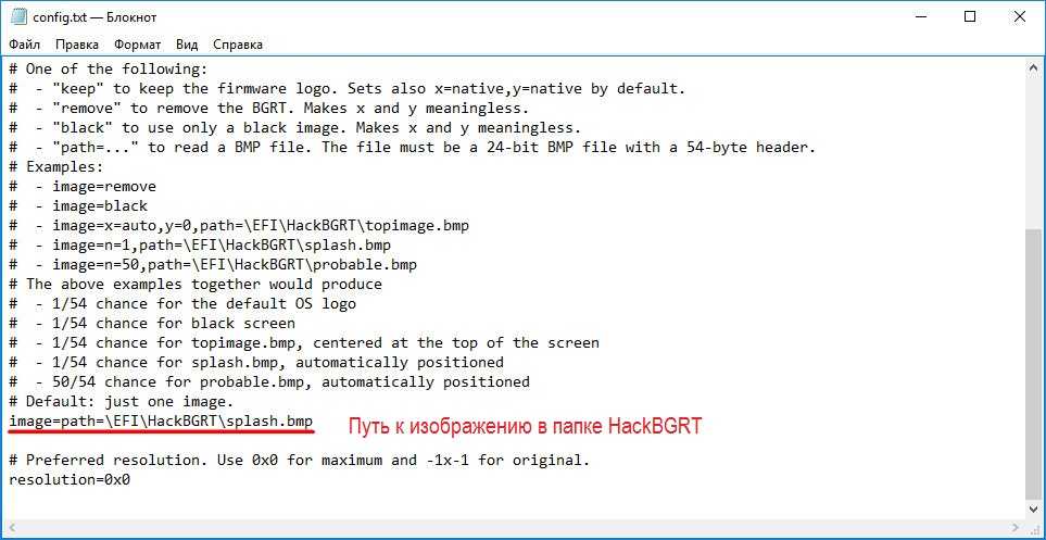 Предназначается этот инструмент для замены логотипа загрузочного экрана своим собственным изображением на UEFI-системах с Windows. Чтобы воспользоваться утилитой, вам нужно распаковать скачанный с сайта разработчика архив, распаковать его и заменить при необходимости имеющееся в папке изображение своим. Оно должно быть обязательно 24-битным и в формате BMP или DIB. Название по умолчанию — splash.bmp. Также вы можете использовать свое название изображения, но тогда вам понадобится отредактировать к нему путь в файле config.tхt.
