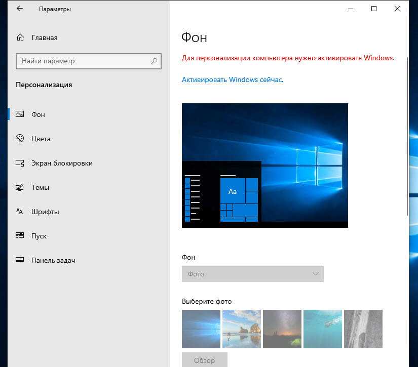 При не активированной системе, в открывшемся приложении «Параметры», во вкладке «Фон» пользователь увидит надпись «Для персонализации компьютера нужно активировать Windows».