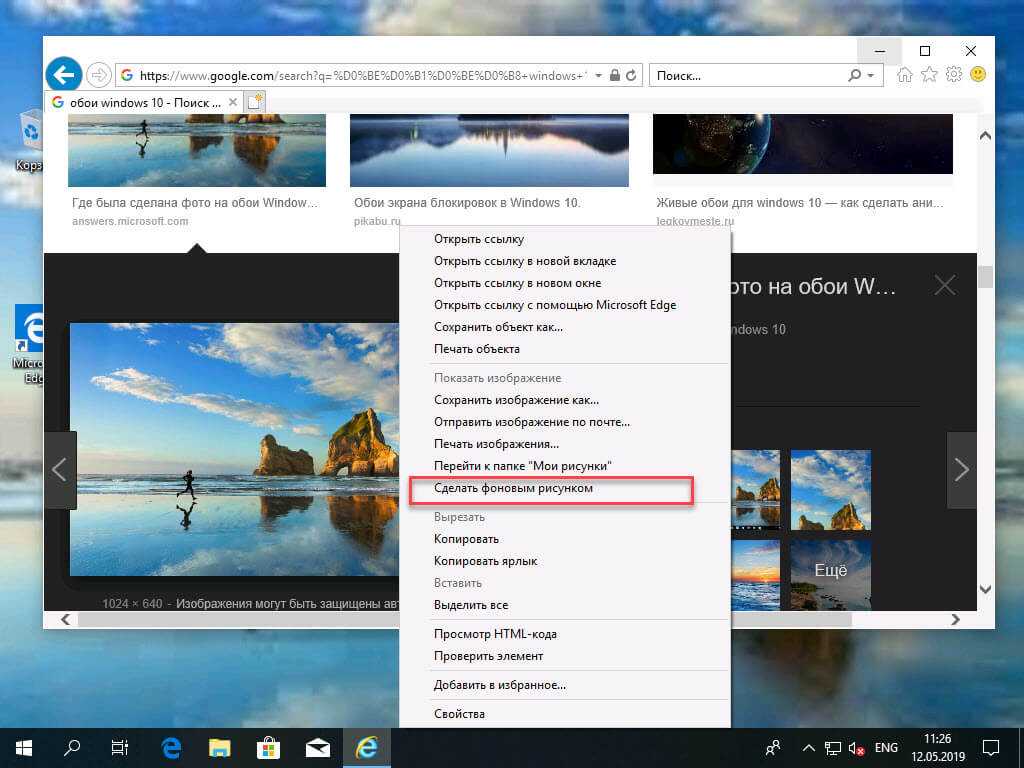 Обратите внимание, что вы должны использовать браузер Internet Explorer, новый браузер Edge не позволяет установить изображение в качестве фонового рисунка рабочего стола