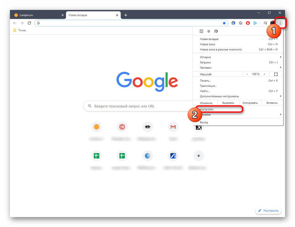 - Запустите браузер и нажмите на кнопку в виде трех вертикальных точек, которая находится на панели в правом верхнем углу. В открывшемся меню зайдите в «Настройки».