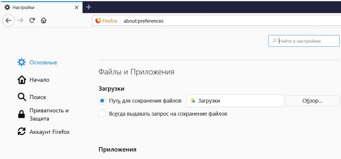 В Firefox меню с настройками скрывается в верхнем углу, где располагаются три горизонтальные полоски. В данном браузере для того, чтобы переместить загружаемые файлы в новую директорию, необходимо выбрать вкладку «Основное» и перейти в раздел «Файлы и приложения».