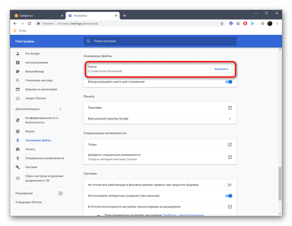 В большинстве случаев папка для загрузок используется браузерами, когда пользователь скачивает файлы любого типа. Практически всегда объекты помещаются в стандартное расположение, в качестве которого и выступает рассматриваемая сегодня директория. Изменение этого параметра или даже отключение автоматического выбора папки не займет много времени. Давайте рассмотрим операцию на примере самого популярного веб-обозревателя Google Chrome.