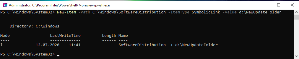 New-Item -Path C:windowsSoftwareDistribution -ItemType SymbolicLink -Value d:NewUpdateFolder