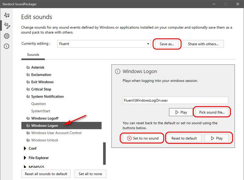 Откроется форма редактирования схемы, и здесь в левой части окна будут представлены системные звуки. При клике на каждый из них он зазвучит. Если он не понравится, в окошке операций над ним можем нажать кнопку «Pick sound file» и заменить на другой. А можем вовсе убрать кнопкой «Set to no sound». Если надо будет вспомнить, как звучит исходный звук, можем нажать кнопку «Play» внизу. А если надо будет вернуть исходный звук, то жмём кнопку рядом «Reset to default». Как и в случае с системными схемами, схемы SoundPackager можем редактировать не исходные, а дубликаты, сохранённые как отдельные схемы с помощью кнопки «Save as».