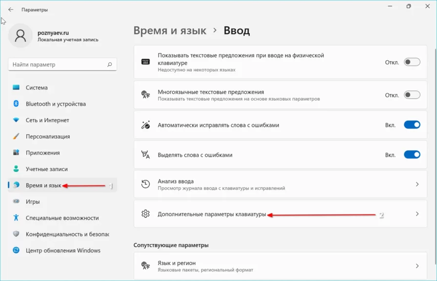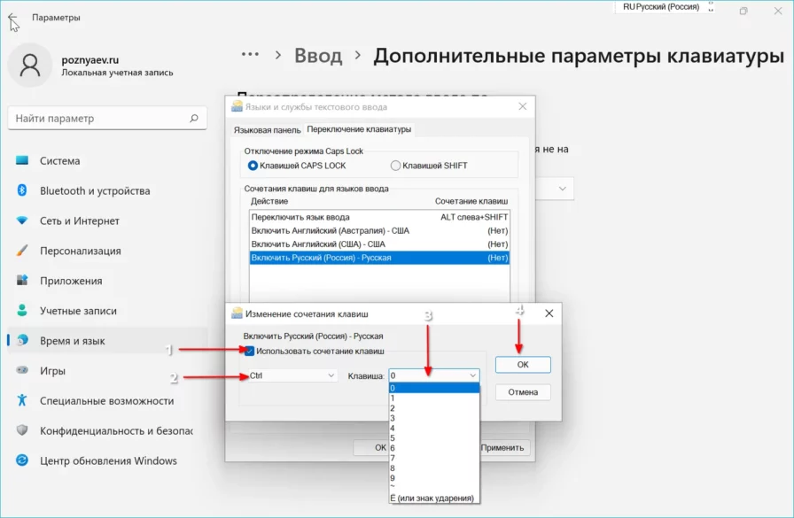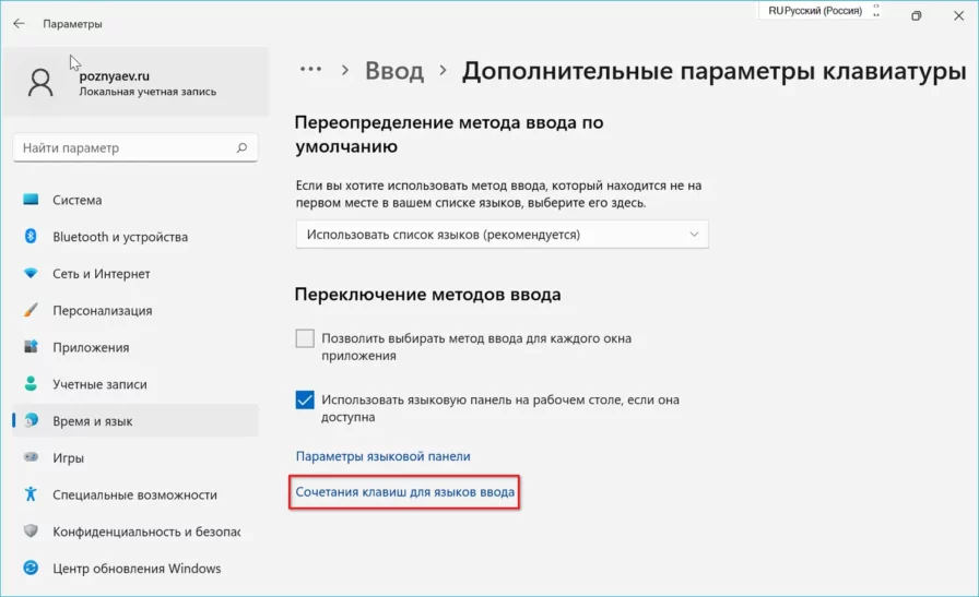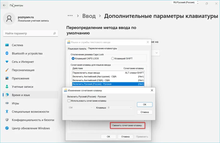 Смена сочетания для переключения клавиатуры на заданный язык в Windows 11
