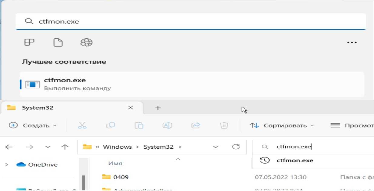 Работу раскладки клавиатуры в Windows 11 обеспечивает файл ctfmon.exe. Если этот файл по какой-то причине не запущен, система не будет реагировать на комбинации клавиш для смены языка. Запустить его можно из меню «Пуск» или через системный каталог. Для входа в этот каталог нужно ввести в адресной строке Проводника адрес C:\windows\system32, можно еще добавить в этот адрес название файла, чтобы его сразу запустить.