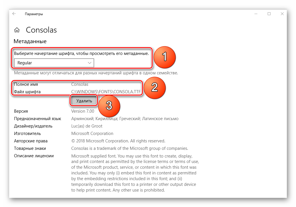3. Если переместиться с помощью прокрутки вниз к разделу «Метаданные», то можно посмотреть подробную информацию о выбранном элементе (имя, место расположения на ПК), выбрать основной вариант его начертания или удалить шрифт.