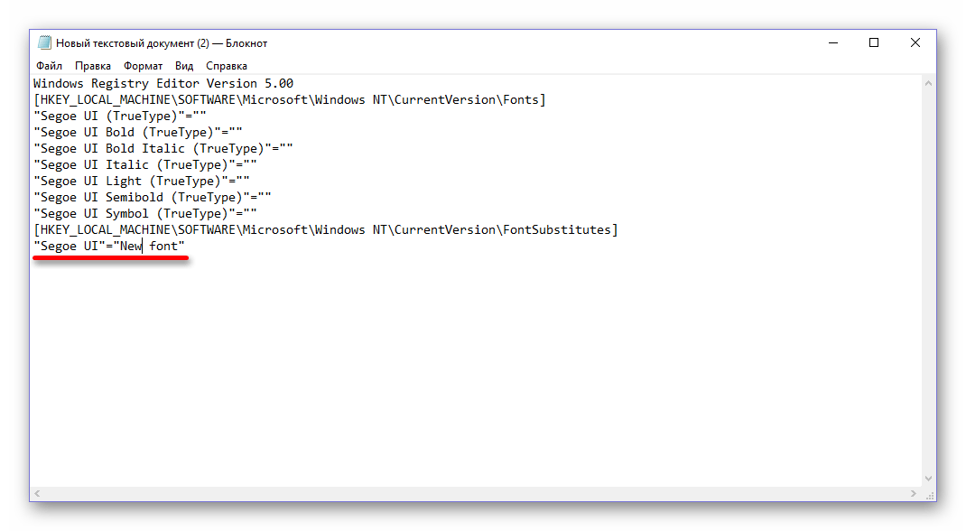 Windows Registry Editor Version 5.00 «Segoe UI (TrueType)»=»» «Segoe UI Bold (TrueType)»=»» «Segoe UI Bold Italic (TrueType)»=»» «Segoe UI Italic (TrueType)»=»» «Segoe UI Light (TrueType)»=»» «Segoe UI Semibold (TrueType)»=»» «Segoe UI Symbol (TrueType)»=»» «Segoe UI»=»New font»