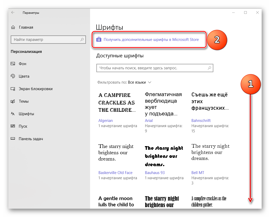 Дополнительные шрифты можно получить из Microsoft Store, установив их как обычное приложение. Для этого достаточно нажать по соответствующей ссылке в окне со списком доступных вариантов.