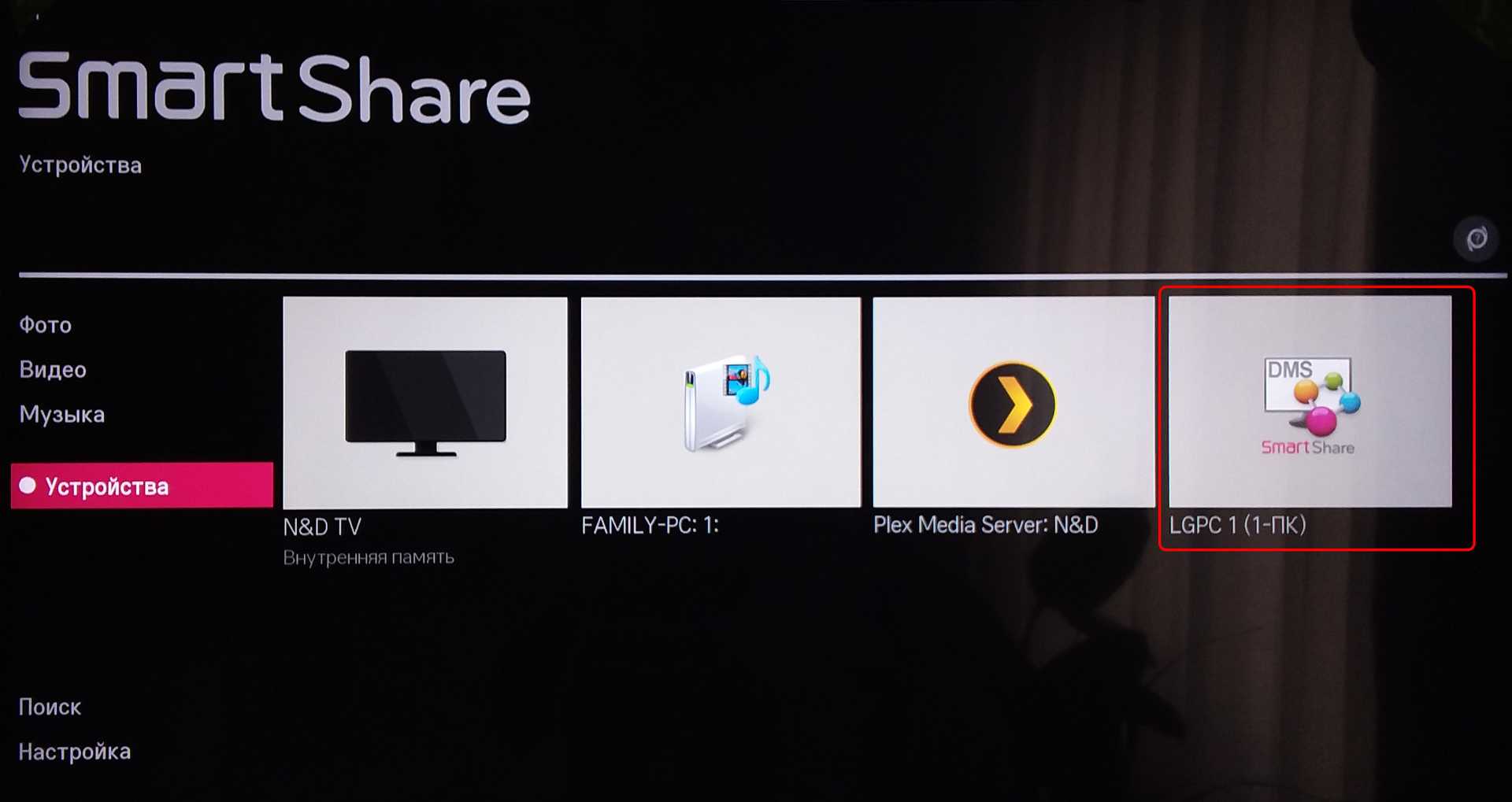 Телевизоры, подключённые к домашней сети, находят сервер и папки с разрешённым к просмотру контентом в автоматическом порядке. На телевизорах LG папки доступных медиасерверов появляются в одном ряду с предустановленными программами и функциями.