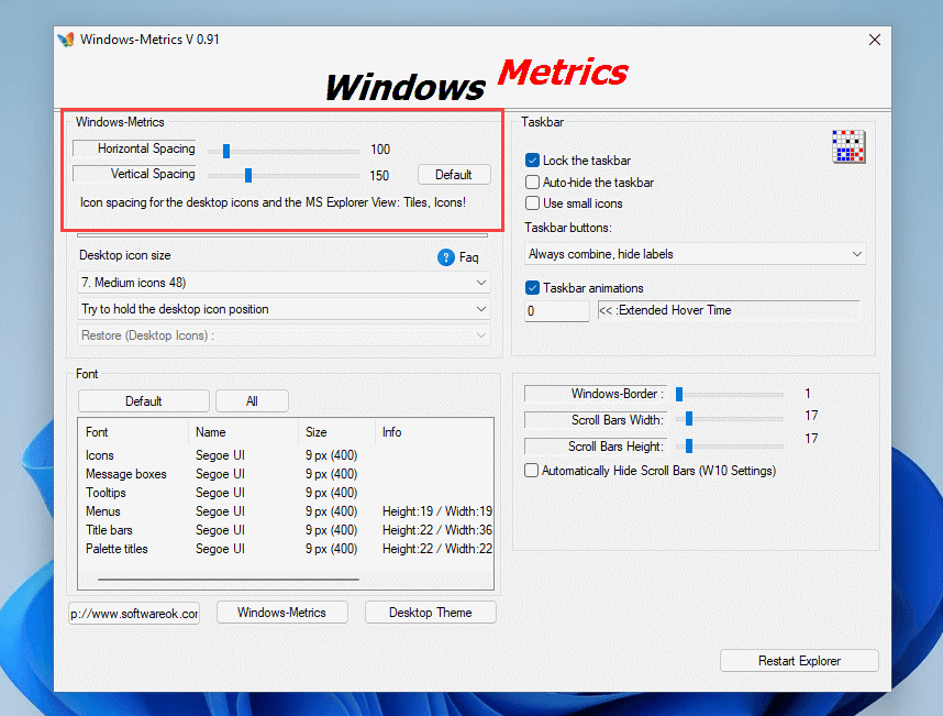 On the Windows Metrics window, use the sliders next to Horizontal Spacing and Vertical Spacing to make the required changes to icon spacing. The changes should apply immediately. If they don’t, select Restart Explorer to force-restart File Explorer.
