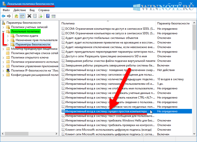 - Войдите в раздел «Локальные политики», разверните «Параметры безопасности», перейдите в «Интерактивный вход в систему: предел простоя компьютера».