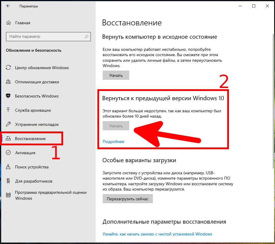 Вернуться к предыдущей версии Windows 10