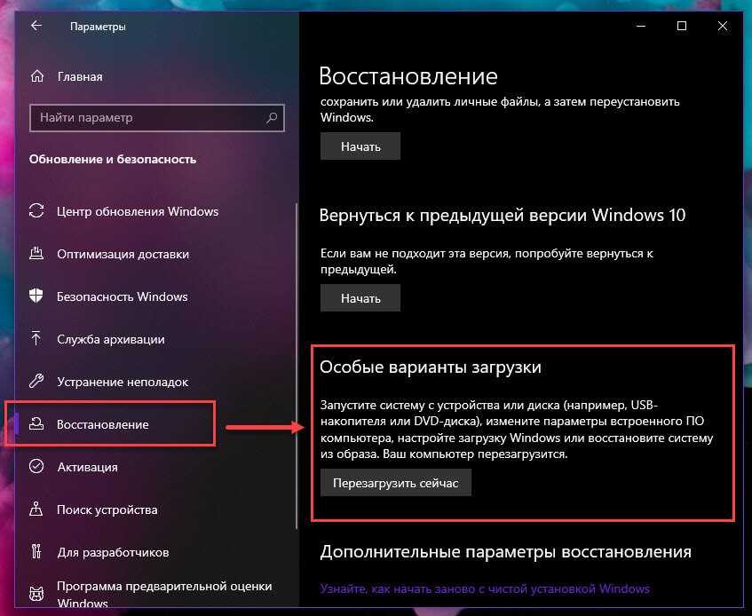 - потом из раздела «Восстановление» перейти в «Особые варианты загрузки»;