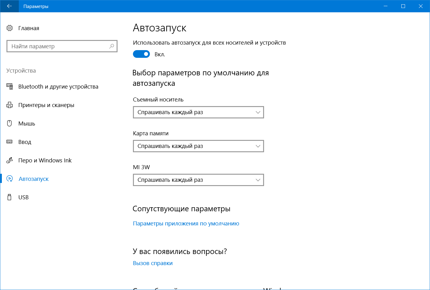 (это самый быстрый способ открыть Параметры) и перейдите в раздел Устройства – Автозапуск