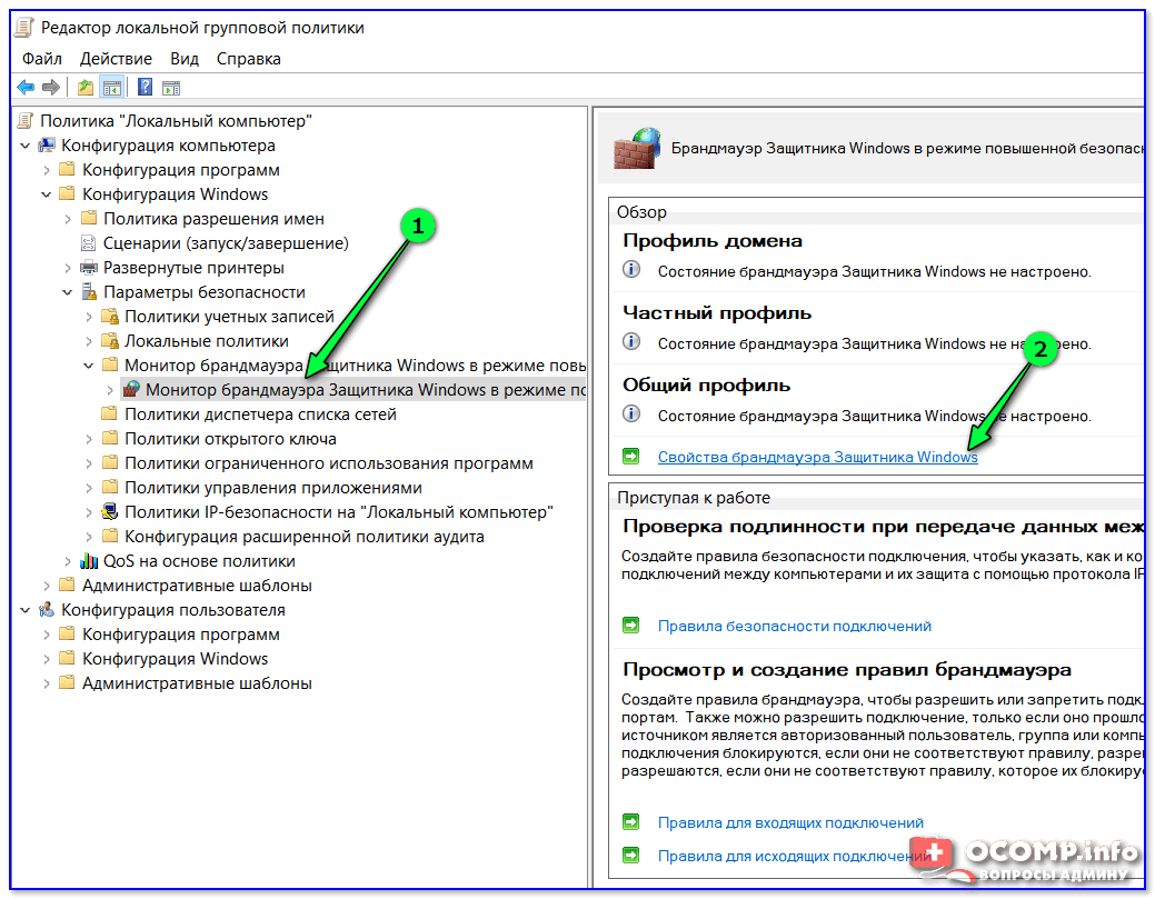 2) Далее нужно открыть вкладку «Конфигурация компьютера / Конфигурация Windows / Параметры безопасности / Монитор брандмауэра защитника Windows. / Монитор брандмауэра защитника Windows. « . После перейти в свойства защитника (см. пример ниже).