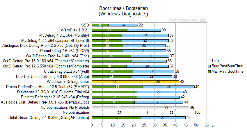 Без оптимизации жесткого диска компьютер загружался за 50 секунд, встроенный дефрагментатор изменил ситуацию в лучшую сторону – время загрузки уменьшилось на 8 секунд. В среднем дефрагментация сократила время полной загрузки Windows на 11 секунд или 22% (без учета SSD). В зависимости от используемого дефрагментатора результаты могут различаться.