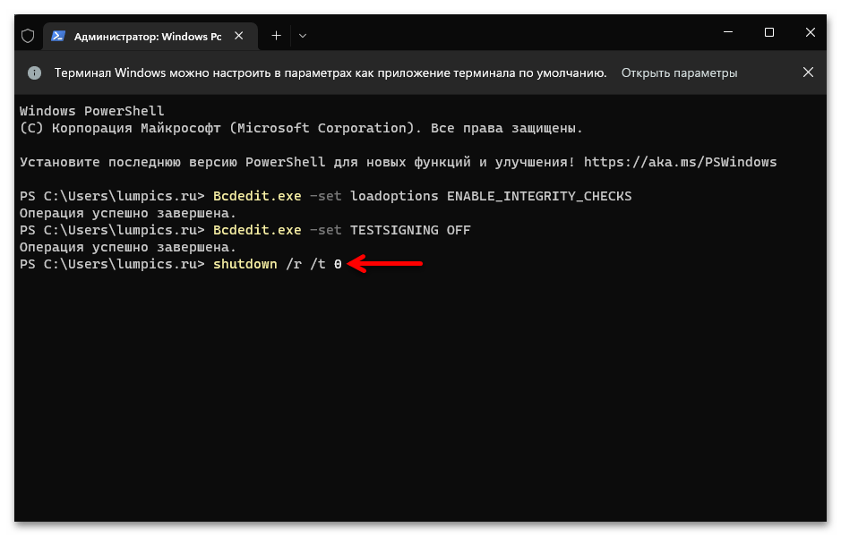 Основной способ отключения тестового режима в Windows 11 предполагает изменение данных конфигурации загрузки ОС при помощи интегрированной в неё утилиты BCDEdit. Практически это реализуется путём отправки на выполнение системой специальных команд через любое средство работы с консолью («Командную строку», «PowerShell» или, как в примере далее, — приложение «Терминал»).