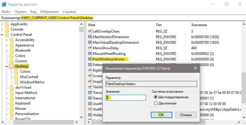 - кликаем по параметру PaintDesktopVersion, изменив его значение на 0 (если такой параметр отсутствует, создаём его, тип DWORD 32).