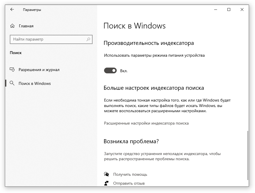 Изменять режим производительности индексатора стало возможным с момента появления Windows 10 версии 2004 (майское обновление 2020 года). Если включить параметр «Использовать параметры режима питания устройства», служба Windows Search будет оценивать, запущен ли на компьютере режим энергосбережения, пониженного электропотребления или игровой процесс. Если да, то служба поиска приостановит индексацию в фоновом режиме.