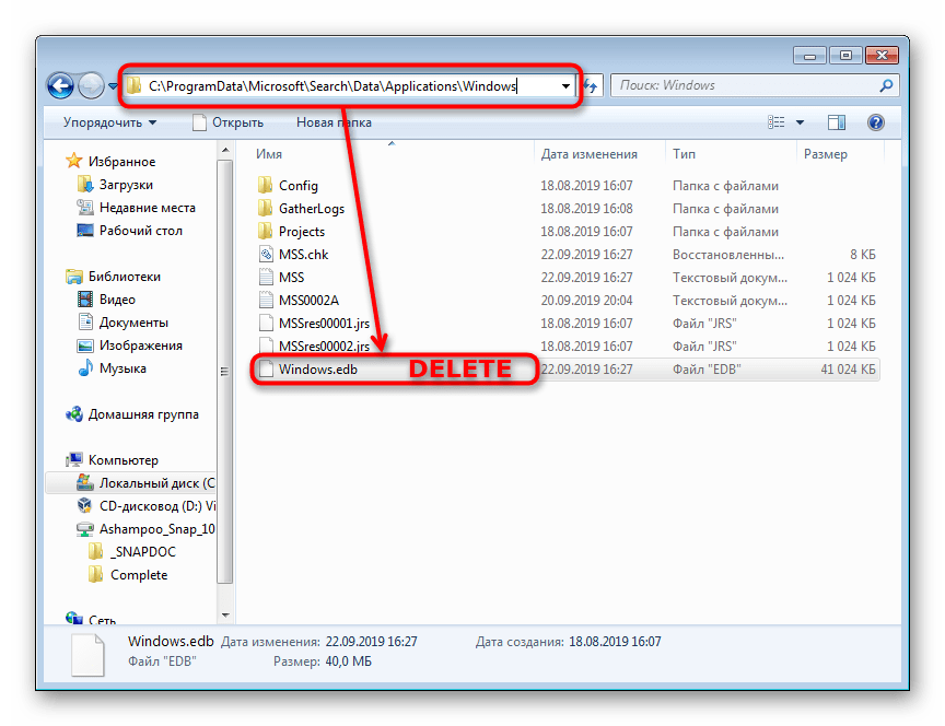 - Найдите в папке файл «Windows.edb» и посмотрите его размер. Если он большой и вы желаете освободить место, занимаемое им, удаляйте его в «Корзину» или выделите и нажмите Shift + Enter для безвозвратного удаления.
