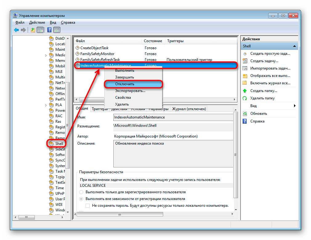 Поочередно разворачивайте «Планировщик заданий» > «Библиотека планировщика заданий» > «Microsoft» > «Windows». Найдите здесь папку «Shell», выделите ее щелчком мыши. Справа проверьте, есть ли в списке задача «IndexerAutomaticMaintenance». Она отвечает за обновление индекса поиска, и чтобы этого действия не происходило, просто кликните по ней ПКМ и выберите «Отключить». Можете и вовсе вместо этого «Удалить» ее.