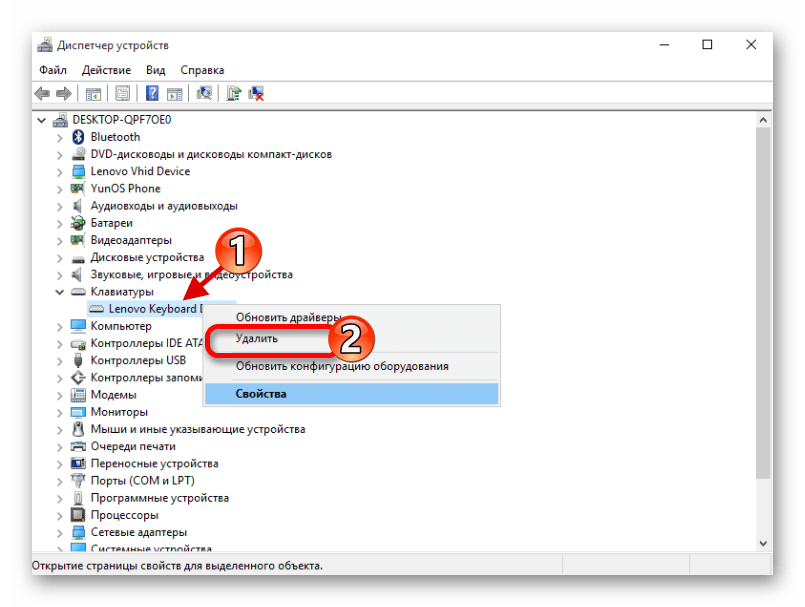 В разделе «Клавиатуры» диспетчера устройств, нажмите правой кнопкой по вашей клавиатуре и выберите пункт «Отключить». Если данный пункт отсутствует, то используйте «Удалить».