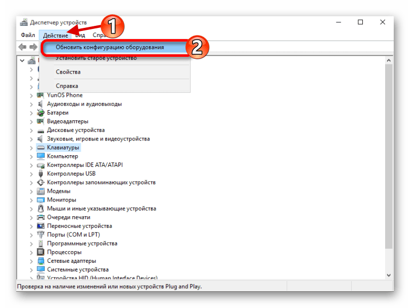 В дальнейшем, чтобы снова включить клавиатуру, вы можете аналогичным образом зайти в диспетчер устройств, кликнуть правой кнопкой мыши по отключенной клавиатуре и выбрать пункт «Задействовать». Если же вы использовали удаление клавиатуры, то чтобы она снова была установлена, в меню диспетчера устройств выберите Действие — Обновить конфигурацию оборудования.