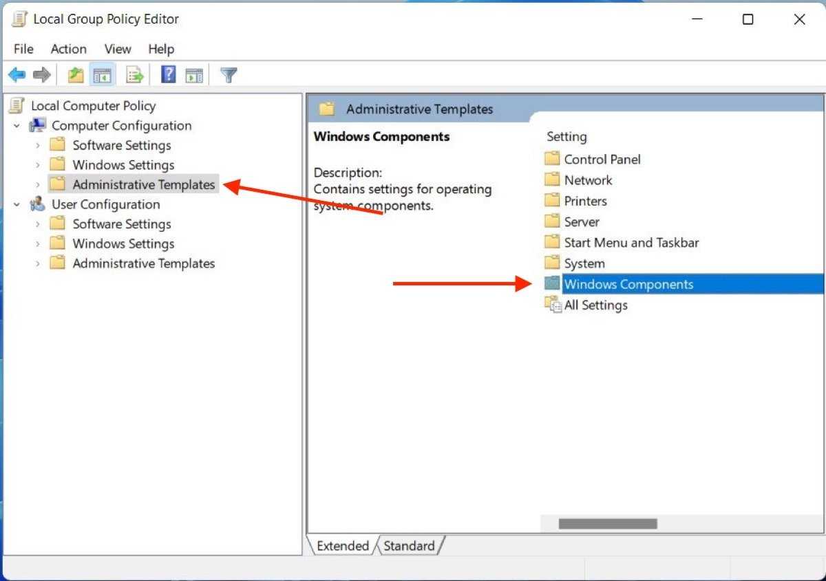 - Go to Administrative Templates, and then, to Windows Components.