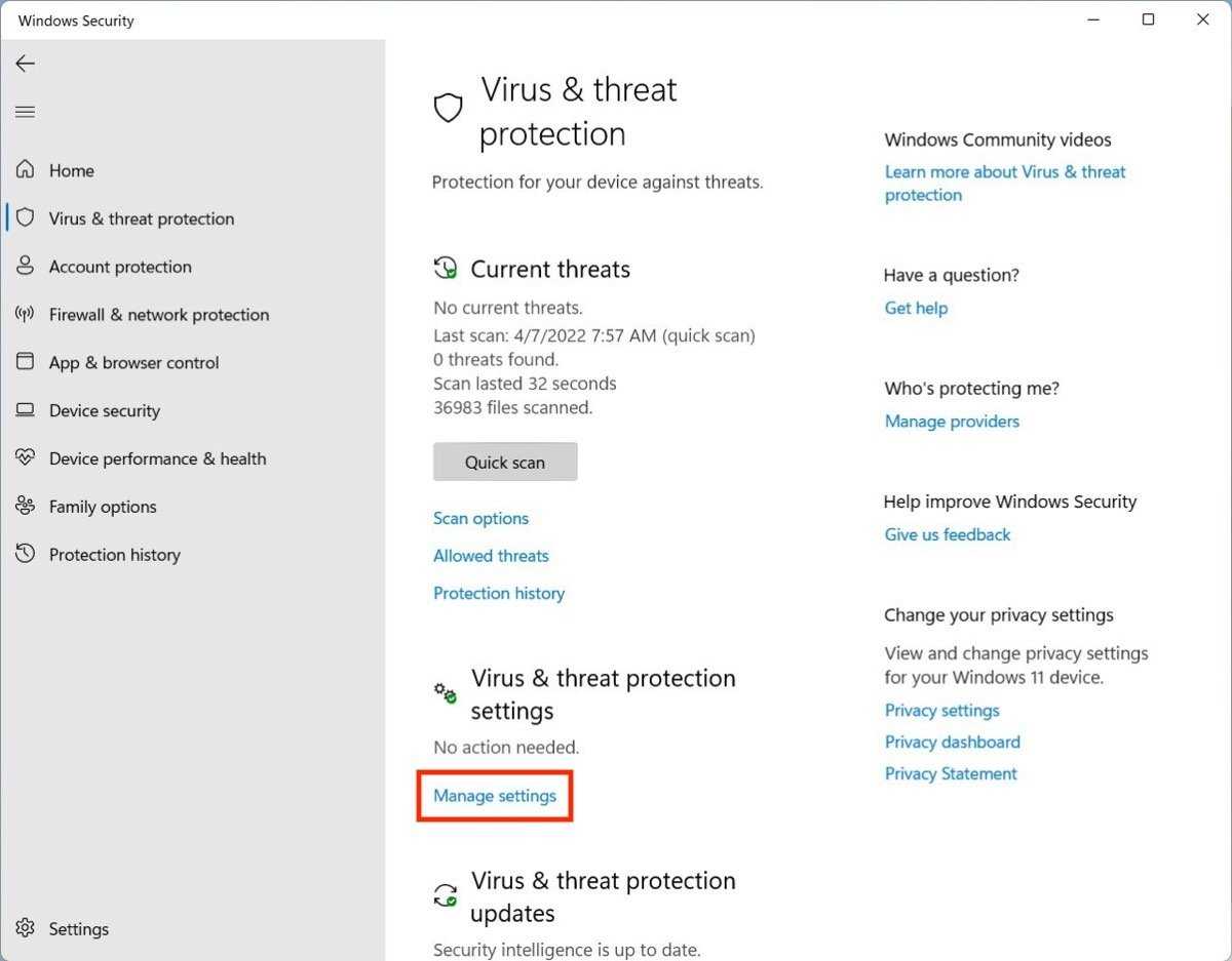 - Open Virus and threat protection and click Manage Settings;