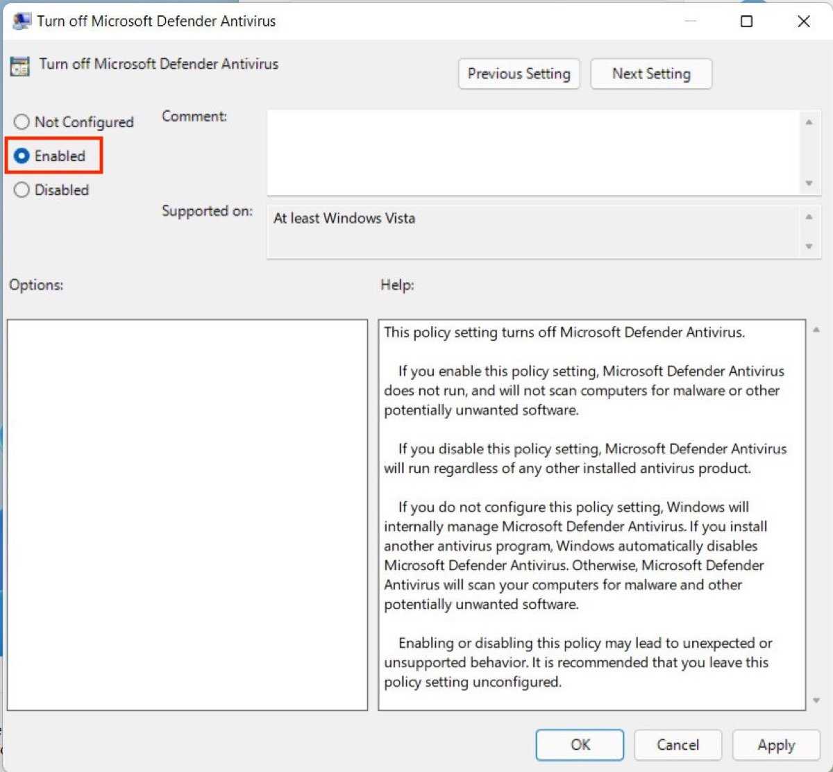 By clicking on Ok, Windows Defender will be permanently disabled. If you want to re-enable virus protection, repeat the above steps and check the Not Configured option. In short, to make it clear to you: