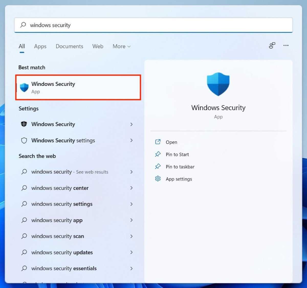 - Search for Windows Security in the Windows search box and click the first result.