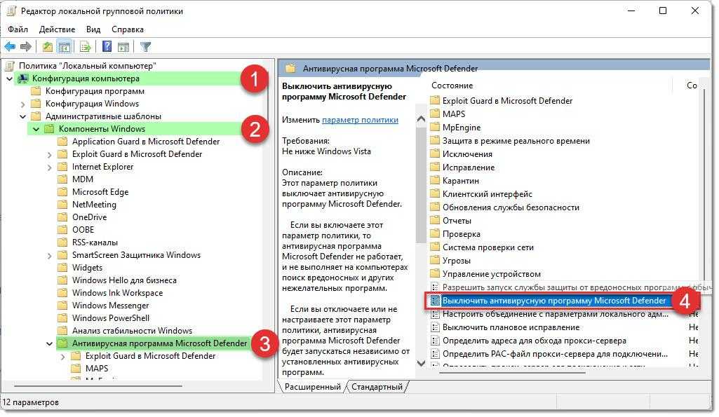 Также вручную включить стандартный антивирус Windows 10 можно через Редактор локальной групповой политики. Для этого выполняем следующее: