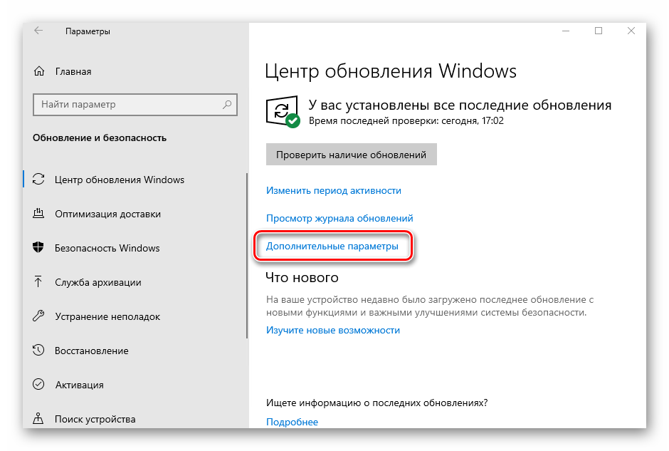 - Раскройте заголовок «ДополнительныеПараметры», без перехода в «ЦентрОбновлений»;