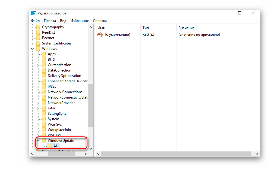 - Воспользовавшись левой частью в реестре пройдите путь: HKEY_LOCAL_MACHINE\ SOFTWARE\ Policies\ Microsoft\ Windows\ WindowsUpdate\ AU;