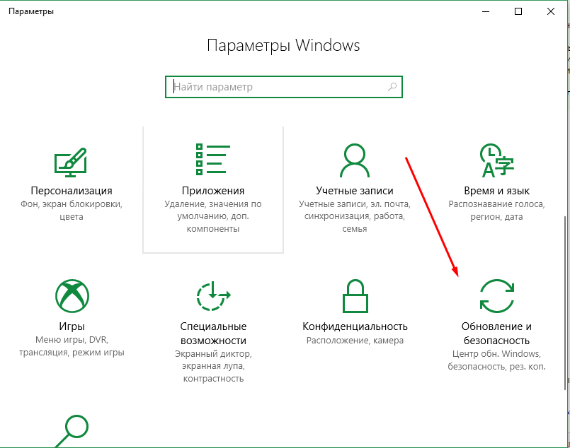 Через открывшееся окно «Параметры Windows» необходимо попасть в раздел «Обновление и безопасность». Достаточно кликнуть по его названию один раз левой кнопкой мышки.