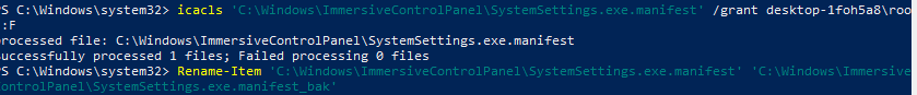takeown /F ‘C:\Windows\ImmersiveControlPanel\SystemSettings.exe.manifest’icacls ‘C:\Windows\ImmersiveControlPanel\SystemSettings.exe.manifest’ /grant desktop-1foh5a8\root:F