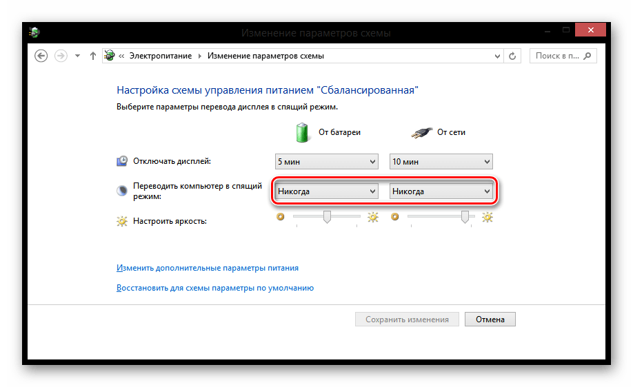 - Рядом с пунктом «Переводить компьютер в спящий режим» будет два открывающихся списка, в которых следует выбрать параметр «Никогда». Тогда ни при питании от батареи, ни при подключении от сети компьютер не будет переходить в режим сна. В обоих пунктах выбираем параметр «Никогда», нажимаем «Сохранить изменения»