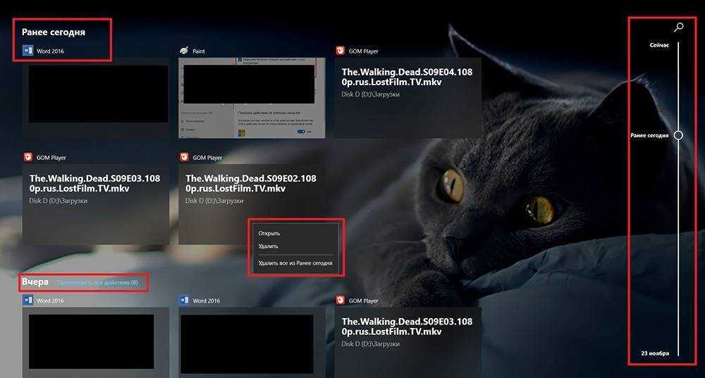 Чтобы начать работу с временной шкалой, выберите Представление задач на панели задач или нажмите Клавиша с логотипом Windows + Вкладка и выберите действие.