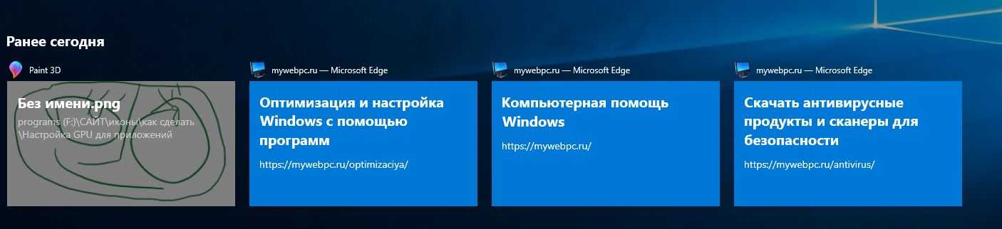 Откроется Временная шкала. Она представляет собой небольшой раздел с блоками, в которых указана дата изменения, тип файла, название, а если это веб-сайт, то и его адрес. Также каждая плитка Временной шкалы имеет небольшое фоновое изображение.