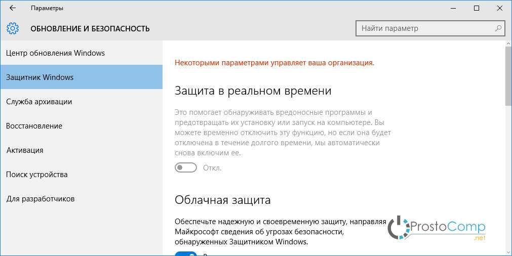 Все, защитник в Windows 10 будет отключен навсегда. Если вы перейдете в параметры, то увидите там что управление защитником неактивно. И будет надпись «Некоторыми параметрами управляет ваша организация».