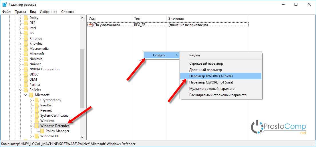 - Если вы не видите DisableAntiSpyware DWORD, щелкните правой кнопкой мыши значок Защитник Windows (папка), выберите «Создать» и нажмите «Значение DWORD (32-разрядное значение)» .