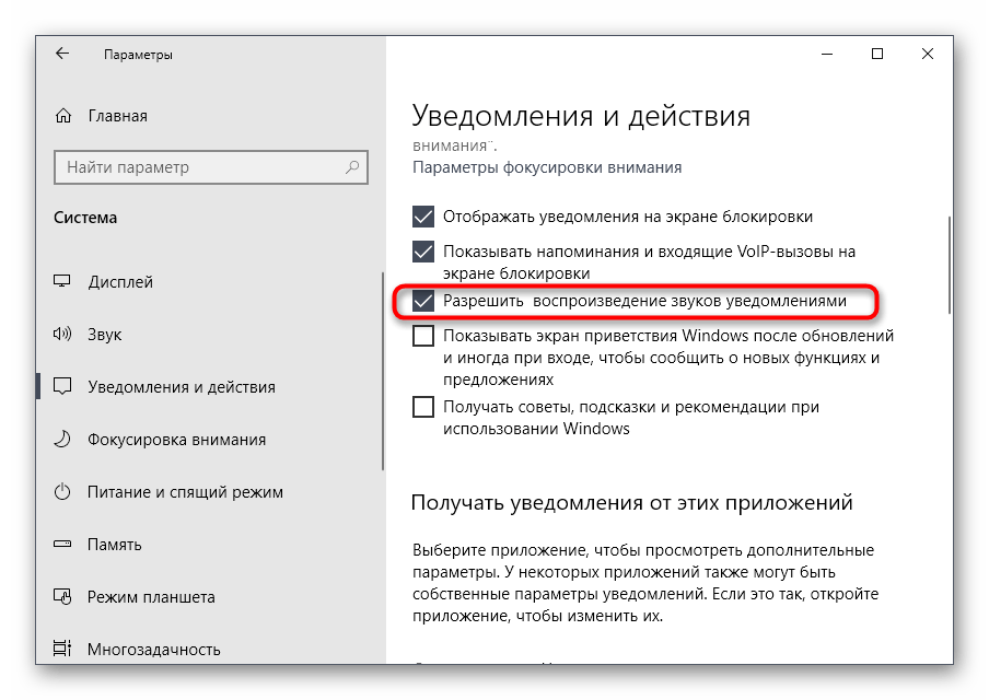 В Windows 10 есть отдельный раздел, в котором настраиваются уведомления. Благодаря ему вы можете отключить их звуковое сопровождение, сняв галочку всего с одного пункта.