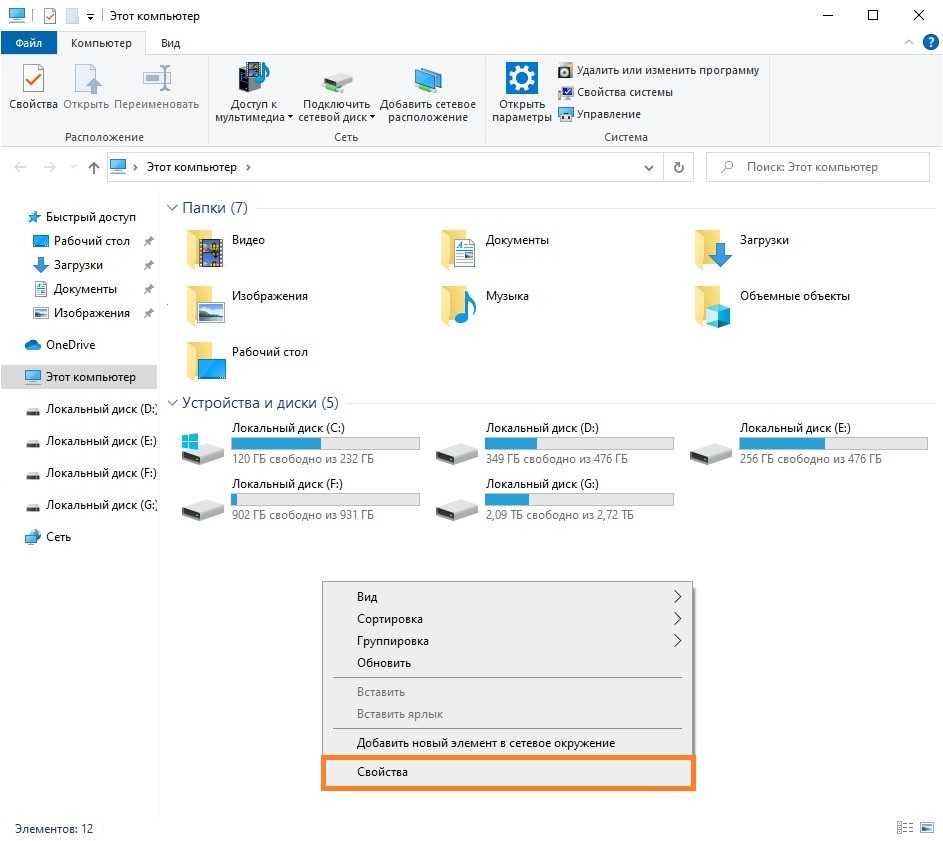 Довольно простой способ — открываем «Этот компьютер» («Мой компьютер»), и кликаем правой кнопкой мыши на любом пустом месте. В появившемся контекстном меню выбираем пункт «Свойства».