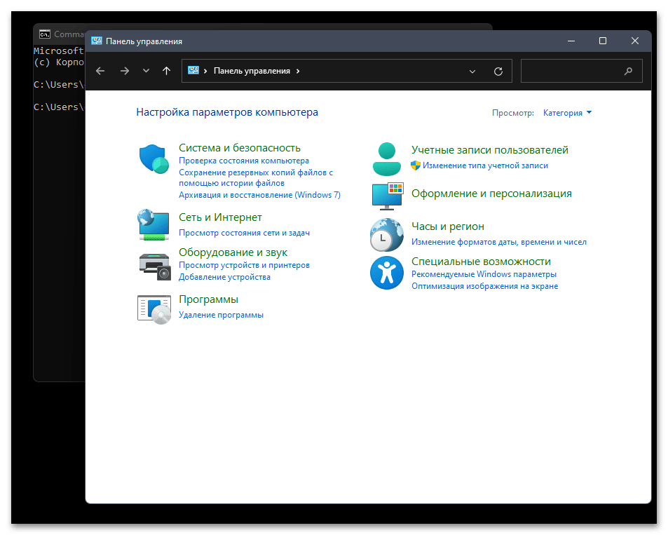 Обратите внимание на то, что «Панель управления» будет открыта отдельным окном, а консоль тоже останется активной. Это позволит одновременно использовать два этих средства, переключаясь между ними по необходимости.