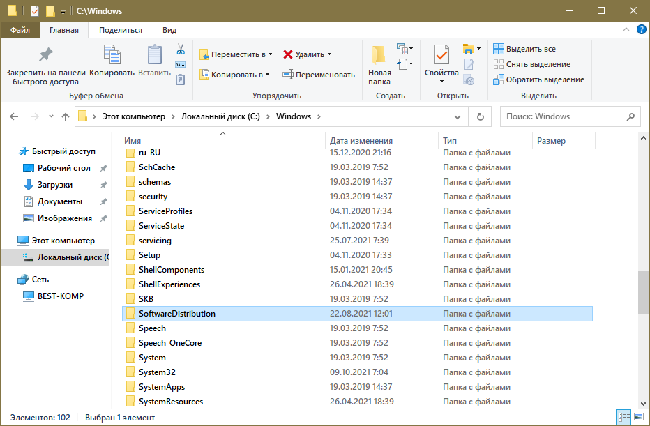 - Перейдите в папку C:\Windows и переименуйте папку SoftwareDistribution в SoftwareDistribution.старый (или что-нибудь еще).