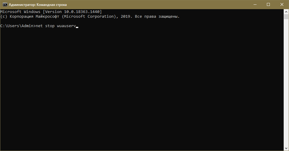 - В командной строке введите net stop wuauserv и нажмите Enter. Вы должны получить сообщение о том, что служба Центра обновления Windows была успешно остановлена. Если вы видите, что не смогли остановить службу, видимо, она сейчас занята обновлением: можно подождать, либо перезагрузить компьютер и временно отключить интернет. Не закрывайте командную строку.