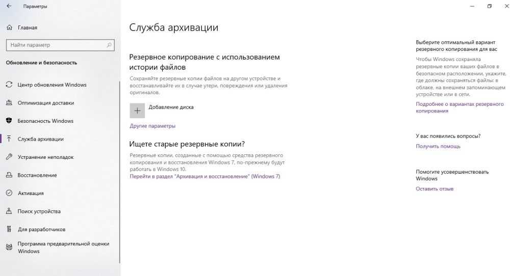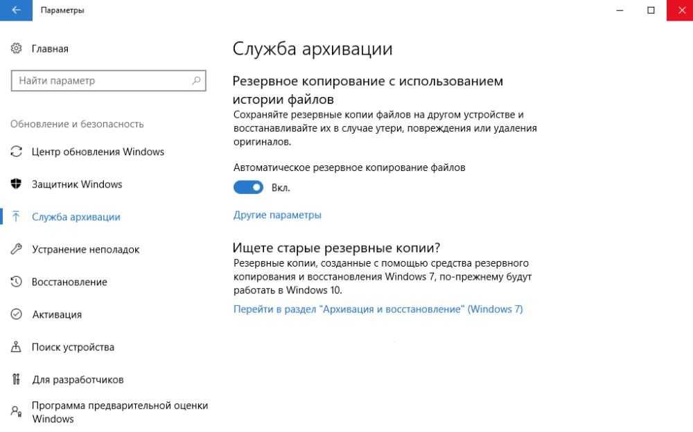 Если после перехода в раздел «Обновление и безопасность» на странице «Службы архивации» в пункте «Автоматическое резервное копирование файлов» ползунок находится в состоянии «Вкл.», резервное копирование данных уже осуществляется.