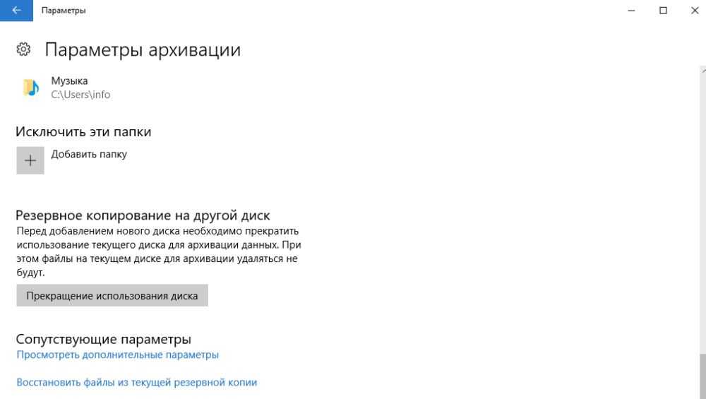 - После выбора накопителя служба запустится автоматически. В «Других параметрах» можно настроить, какие именно папки скопировать, изменить периодичность и срок хранения.