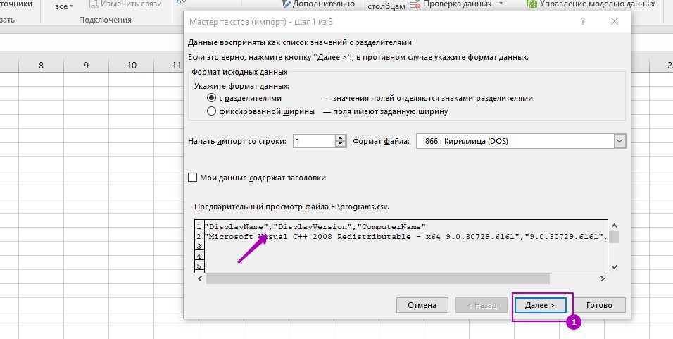 В новом окне посмотреть на разделитель, который используется, и нажать «Далее»: